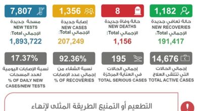 شفاء 1182 إصابة وإجمالي المتعافين 191417
