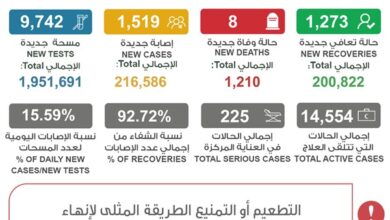 شفاء 1273 إصابة وإجمالي المتعافين 200822