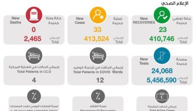 أعلنت وزارة الصحة اليوم عن تسجيل 33 إصابة جديدة بفيروس كورونا المستجد في الساعات الـ 24 الماضية ليرتفع بذلك إجمالي عدد…