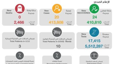 أعلنت وزارة الصحة تسجيل 20 إصابة جديدة بفيروس كورونا المستجد (كوفيد- 19) في الساعات الـ24 الماضية، ليرتفع بذلك إجمالي عدد الحالات…