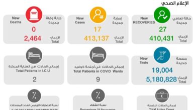 أعلنت وزارة الصحة اليوم عن تسجيل 17 إصابة جديدة بفيروس كورونا المستجد في الساعات الـ 24 الماضية ليرتفع بذلك إجمالي عدد…