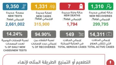 شفاء 1310 إصابة وإجمالي المتعافين 299795