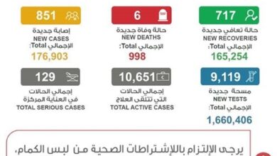 شفاء 717 إصابة وإجمالي المتعافين 165254