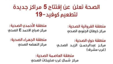 «الصحة»: افتتاح 5 مراكز جديدة للتطعيم ضد كوفيد-19 أعلنت وزارة الصحة اليوم افتتاح خمسة مراكز جديدة لتطعيم (كوفيد 19) ليصبح…