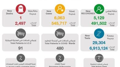 أعلنت وزارة الصحة تسجيل 6063 إصابة جديدة بفيروس كورونا المستجد (كوفيدـ19) في الساعات الـ 24 الماضية ليرتفع بذلك إجمالي عدد الحالات…