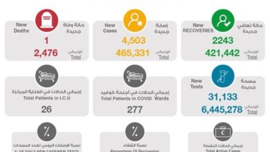أعلنت وزارة الصحة اليوم الاحد تسجيل 4503 إصابات جديدة بفيروس كورونا المستجد (كوفيد 19) في الساعات ال24 الماضية ليرتفع بذلك إجمالي…