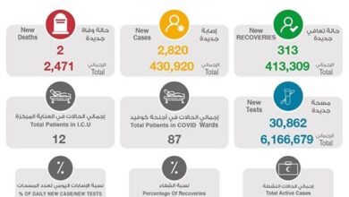 2820 إصابة جديدة بـ «كورونا» وشفاء 313 وتسجيل حالتي وفاة