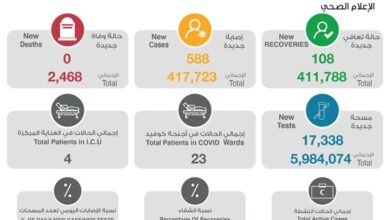 أعلنت وزارة الصحة اليوم عن تسجيل 588 إصابة جديدة بفيروس كورونا المستجد في الساعات الـ 24 الماضية ليرتفع بذلك إجمالي عدد…