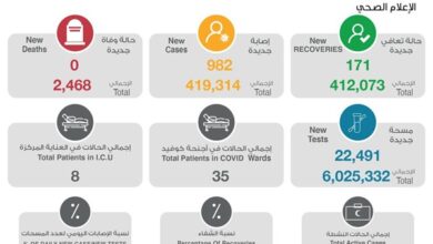 أعلنت وزارة الصحة اليوم عن تسجيل 982 إصابة جديدة بفيروس كورونا المستجد في الساعات الـ 24 الماضية ليرتفع بذلك إجمالي عدد…
