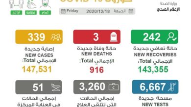 أعلنت وزارة الصحة اليوم الجمعة تسجيل 339 إصابة جديدة بفيروس كورونا المستجد (كوفيد 19) في الساعات الـ 24 الماضية ليرتفع بذلك إجمالي…